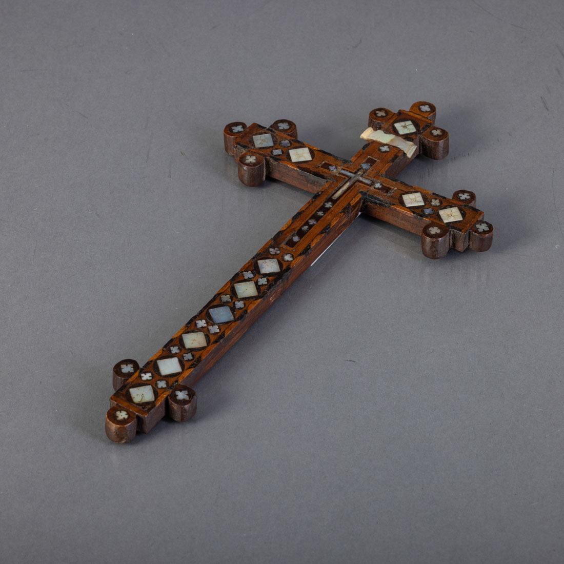 Em madeira de oliveira e outras madeiras com embutidos em madrepérola. Terra Santa, Séc. XX. Pequenas falhas e pequenos defeitos.