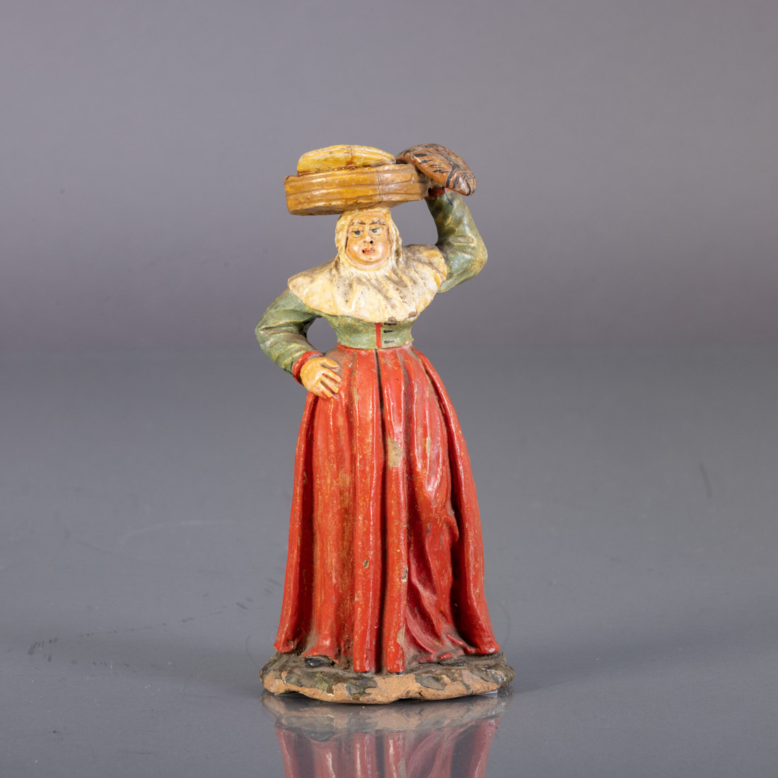 Escultura em barro, decoração policromada. Séc. XVIII/XIX, Pequenas falhas na base, cesto colado.