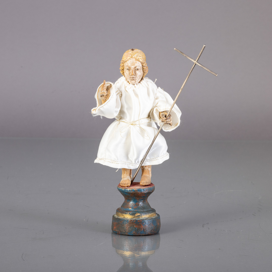 Escultura em madeira policromada e dourada, Séc. XVIII/XIX, peanha pintada e dourada, cruz em prata, sem marcas, ao abrigo do Decreto-Lei n.º 120/2017. Falhas na policromia, falta um dedo e dois restaurados.