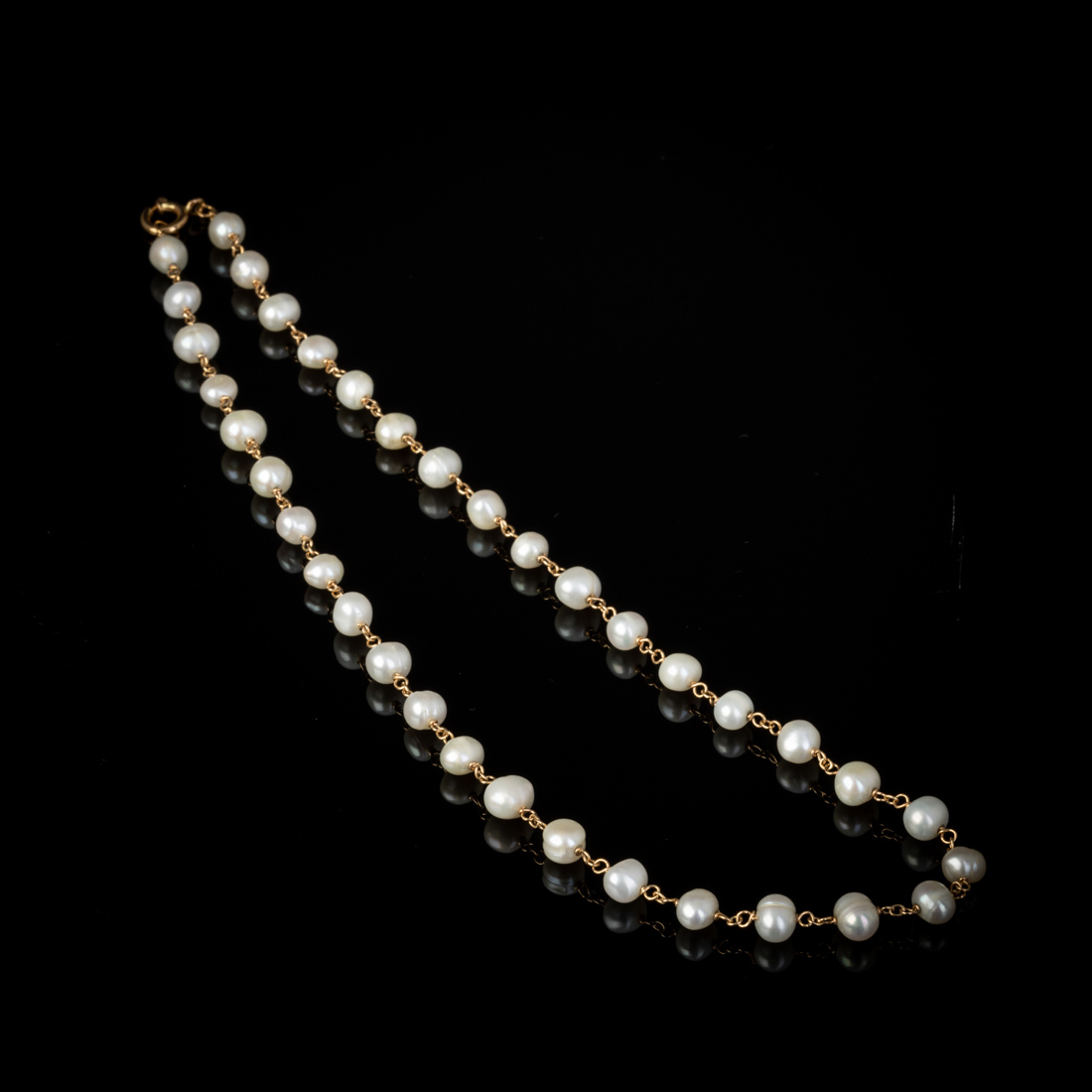Em ouro de 19,2Kt., contraste veado (pós 1985) intercalado com pérolas de água doce. Sinais de uso.