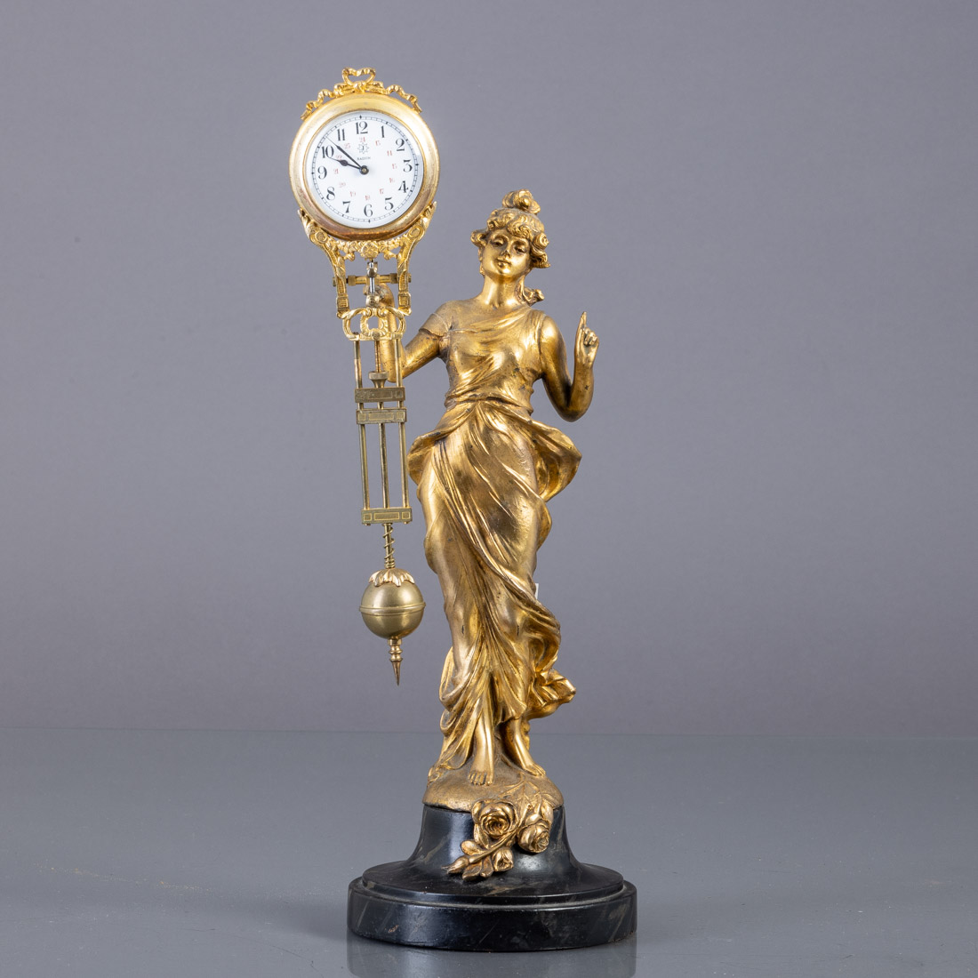 Em liga de metal e bronze dourado, representando figura feminina segurando pêndulo, assinado F. Iffland, mostrador em esmalte com numeração árabe, base em madeira pintada. Alemão, cerca de 1900. Sinais de uso.