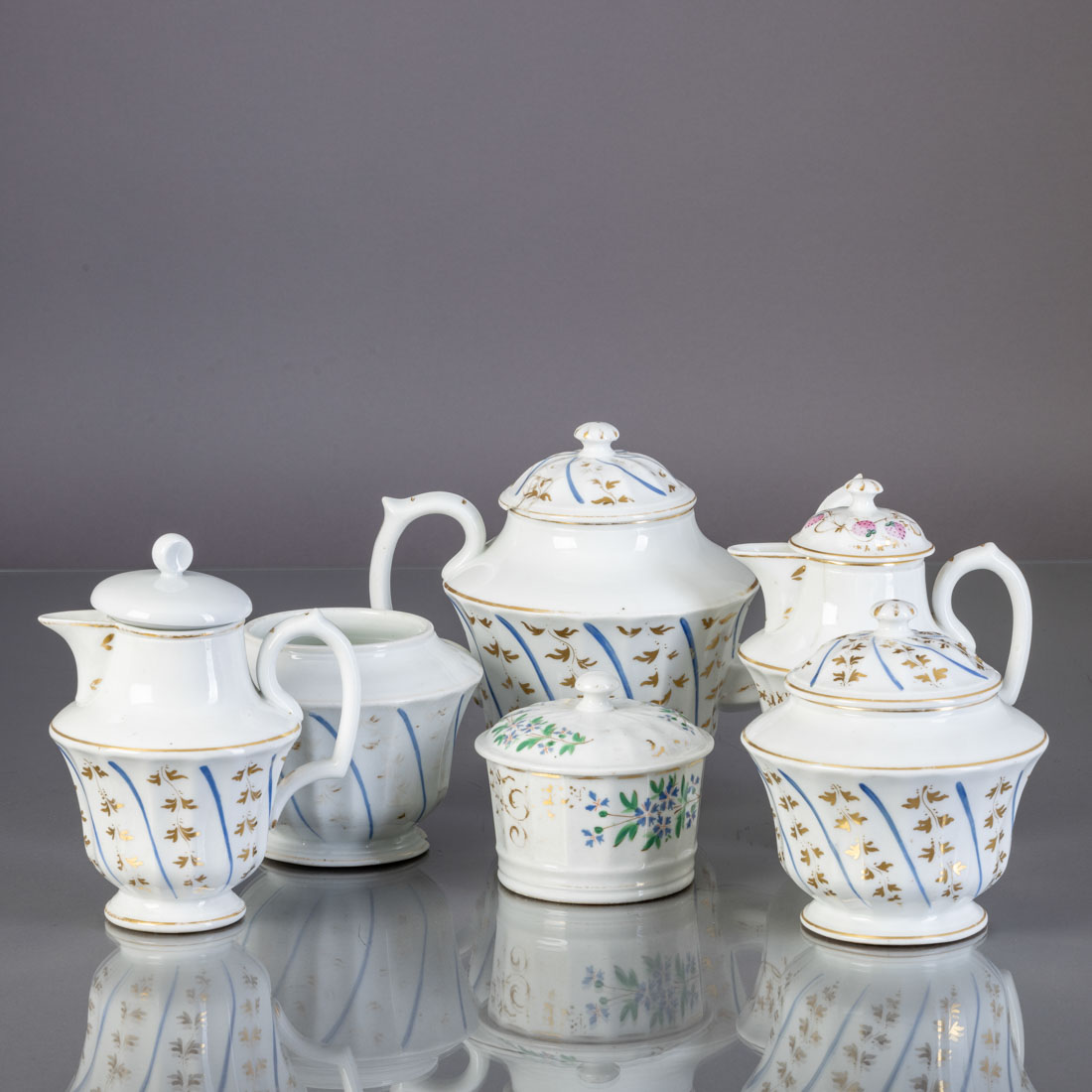 Em porcelana moldada (1870-1880), decoração policromada e dourada "flores" e "frutos". Composto por bules e açucareiros. Tampa do bule não pertence, dois bules com cabelos e um com falhas no bico, açucareiro sem tampa e com falha.