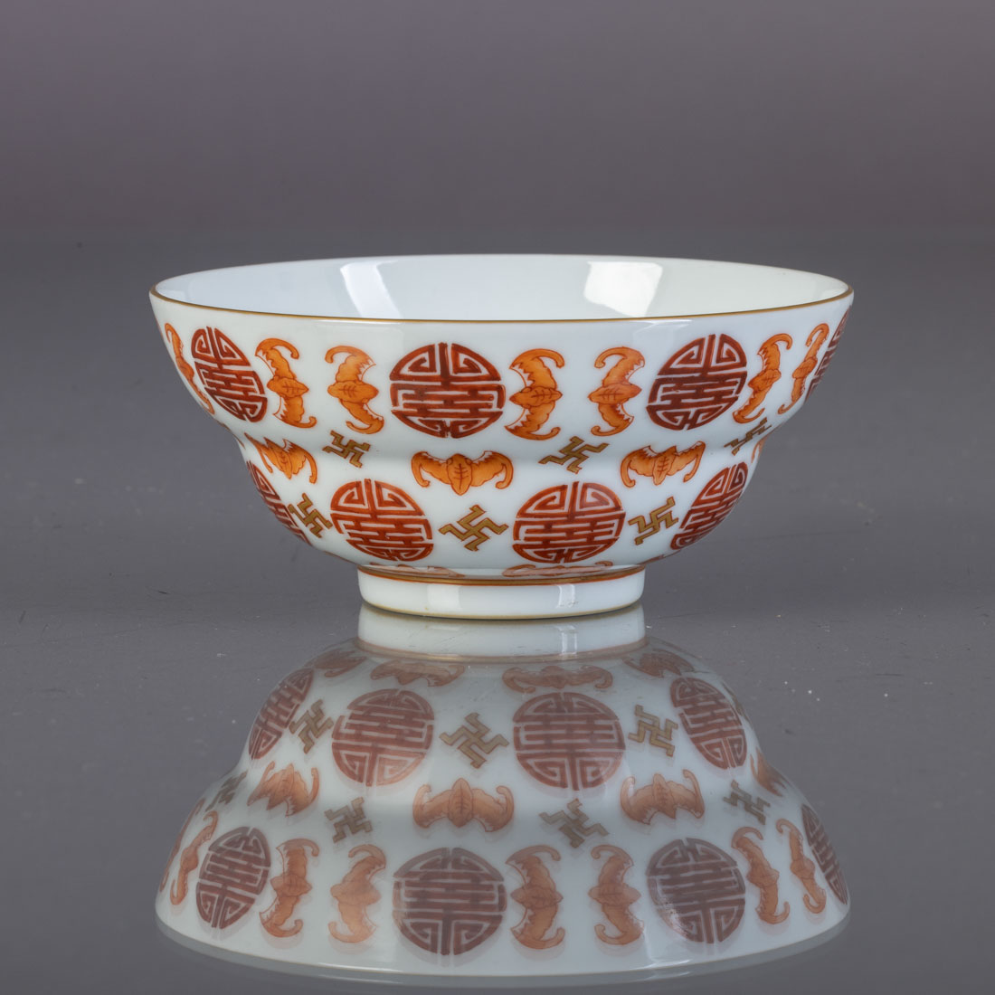 Em porcelana da China, decoração a rouge de fer e dourado com símbolos e morcegos. Marcada. Sinais de uso.