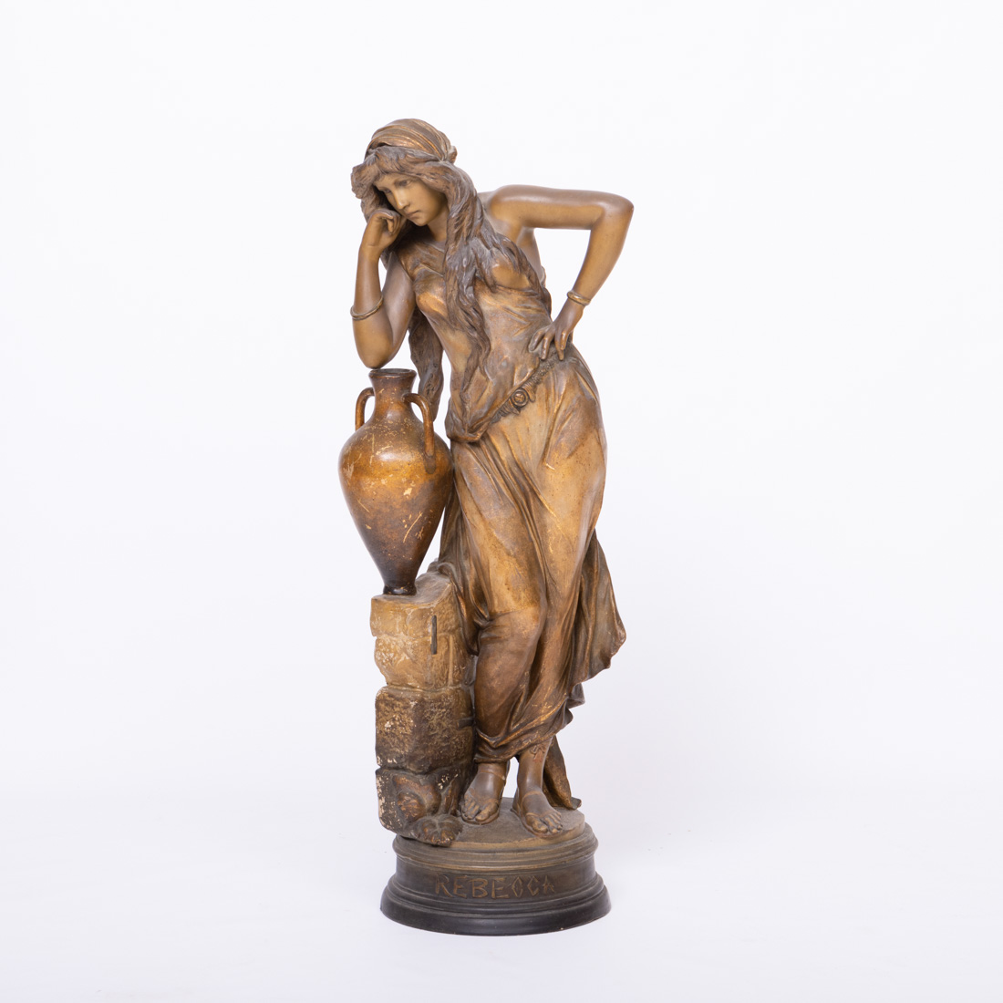 Em terracota policromada, fabrico de Friedrich Goldscheider. Com inscrição "Cherc" na base e "Rebecca" na frente. Marcada "Goldscheider" e Nº 1963-520-3, na parte lateral do muro. Vienna, Séc. XIX/XX. Sinais de uso e pequenos defeitos.