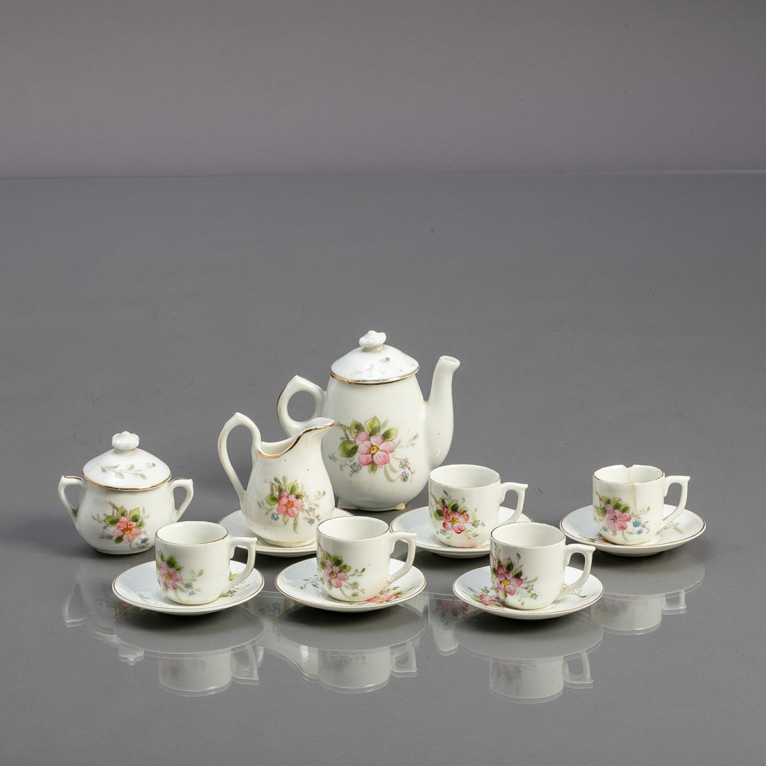 Em porcelana moldada (1881-1921), decoração policromada e dourada "flores. Composto por bule, leiteira, açucareiro e cinco chávenas com seis pires. Desgaste, uma chávena partida e colada, pires e tampa do bule com esbeiçadelas.