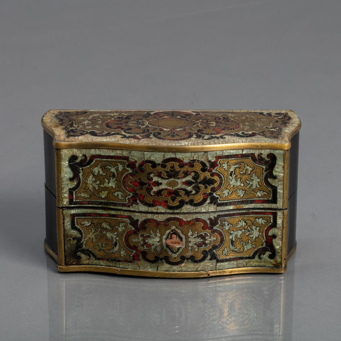 Estilo Boulle, em madeira ebanizada, marchetaria em latão, madrepérola e outros materiais, no interior três divisórias. Com chave. Séc. XIX. Dois frascos miniatura em vidro (não pertence). Pequenos restauros, pequenas falhas e defeitos.