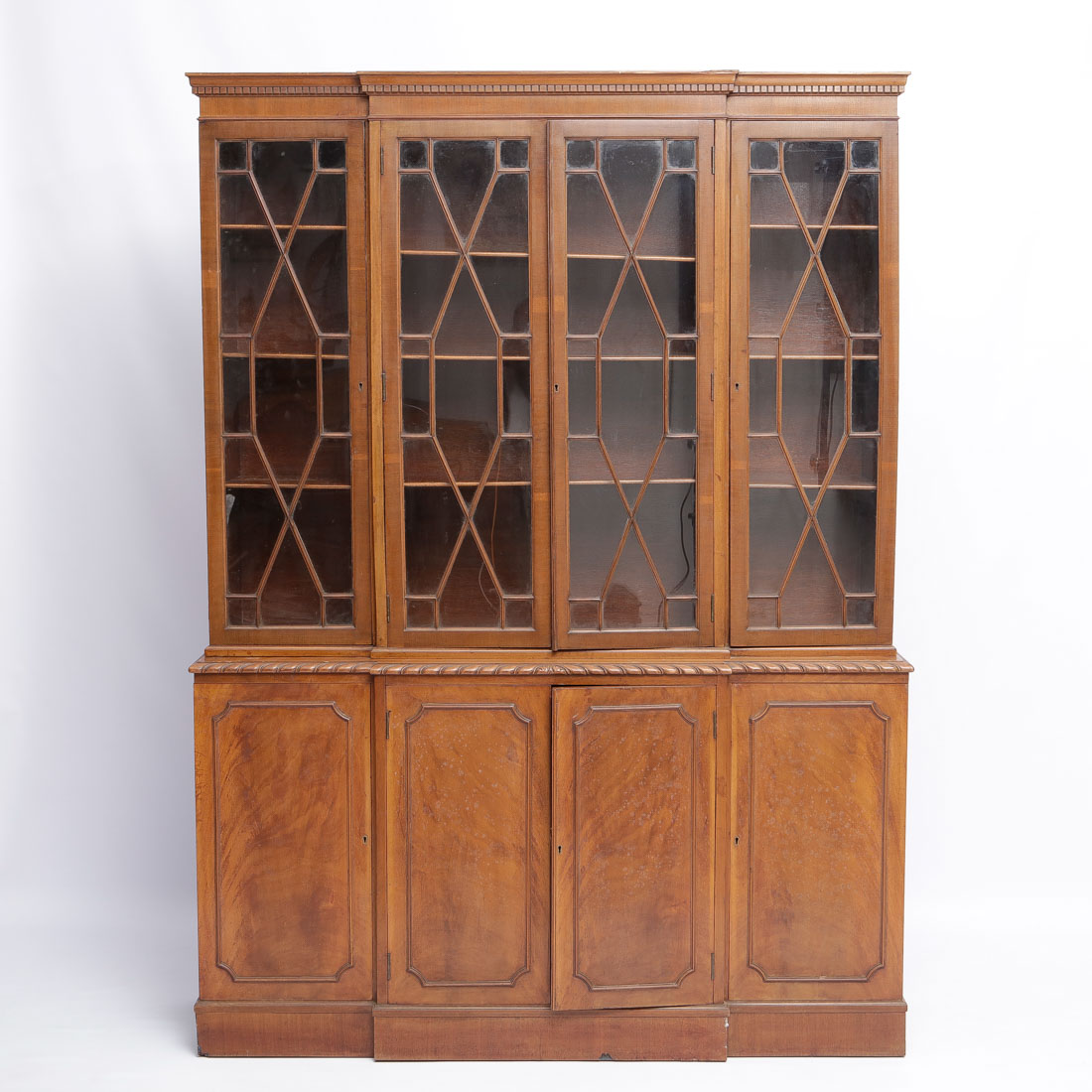 Em mogno e folheado a mogno, parte superior de quatro portas com vidrinhos. Pequenos defeitos.
