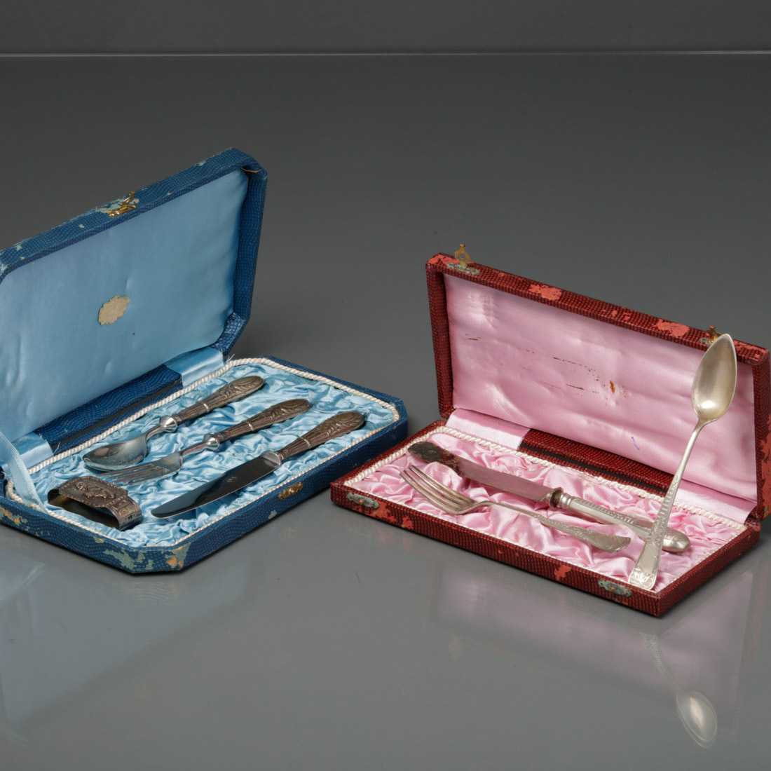 Em prata portuguesa contraste águia (1938-1984) e javali (1887-1937) de 833, decoração relevada e gravada, um estojo com argola para guardanapo e cabos em prata. Sinais de uso.