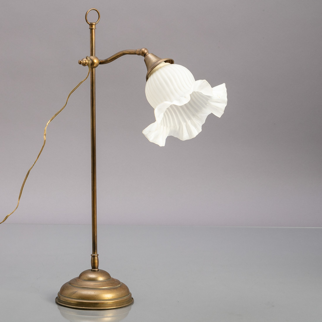 Em metal amarelo, tulipa em vidro fosco relevado e recortado. Regulável. Sinais de uso.