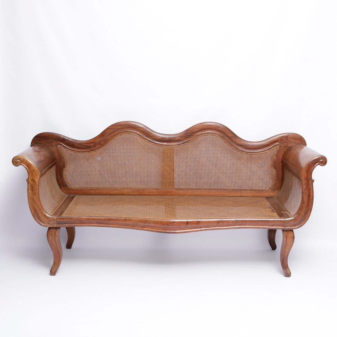 Em vinhático espaldar recortado e braços curvos, assento, costas e laterais em palhinha. Séc. XIX. Falhas e defeitos na palhinha.