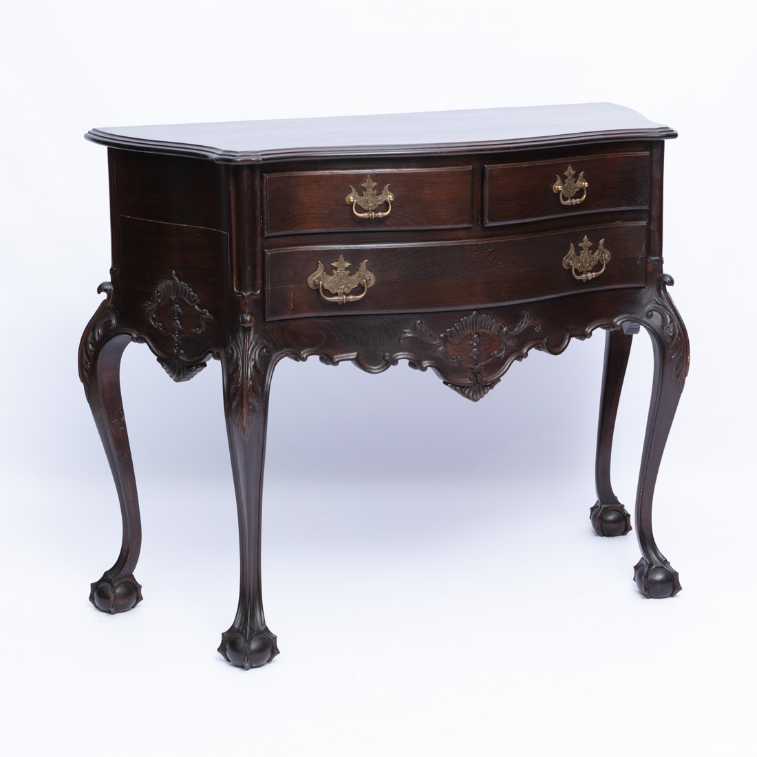 Estilo D. João V, em castanho com entalhamentos, com gavetão e duas gavetas, pernas curvas, pés de garra e bola, saiais recortados, ferragens em metal amarelo. Pequenos defeitos.