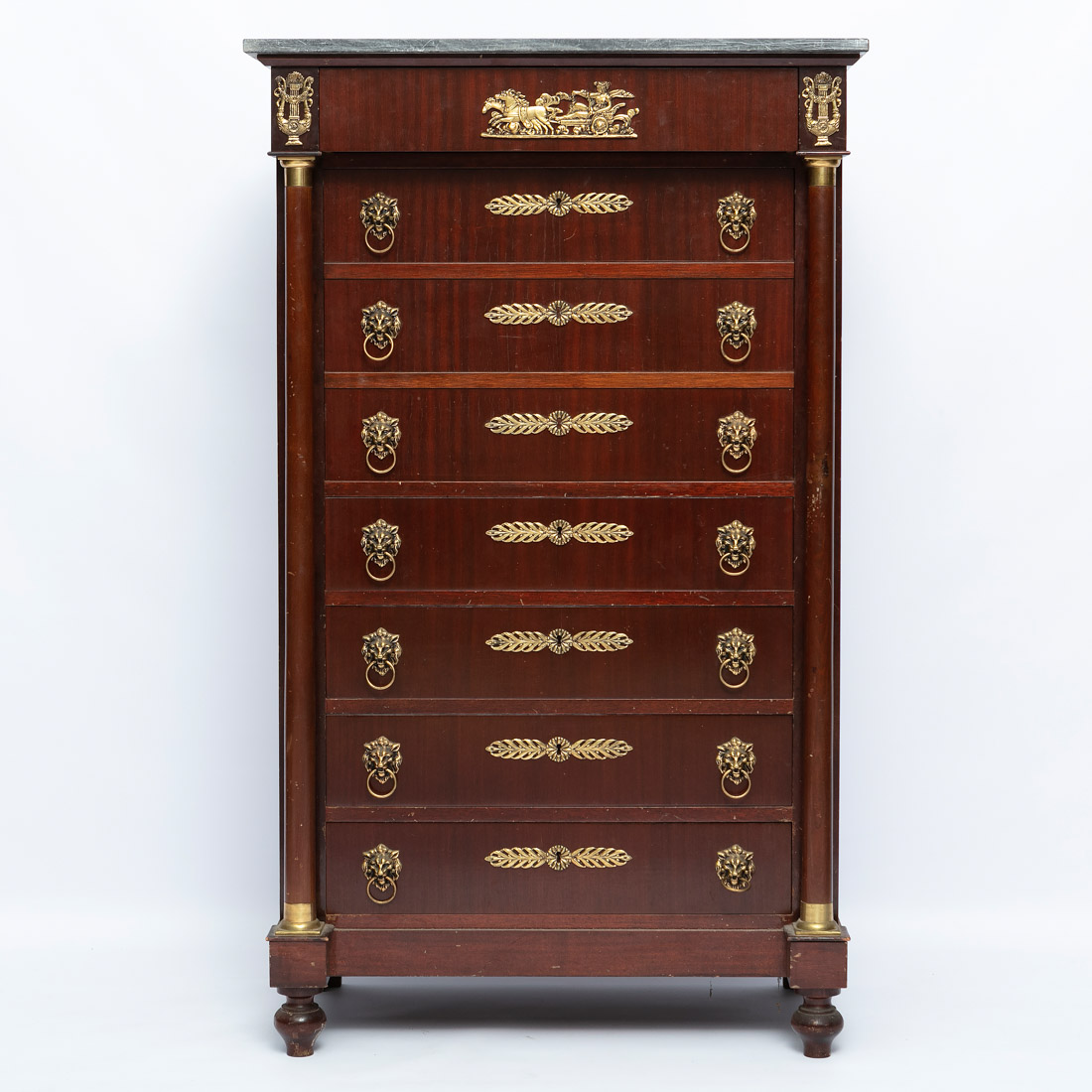 Estilo Império, em mogno e folheado a mogno, tampo de abater, aplicações e ferragens em metal amarelo, tampo em mármore. Pequenos defeitos.
