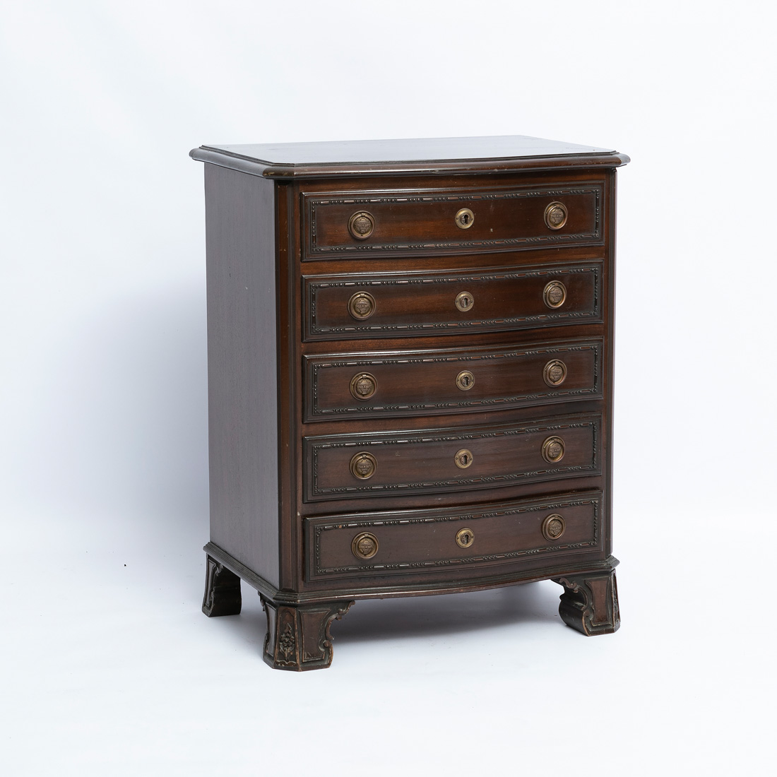 Em mogno com entalhamentos, de cinco gavetas, ferragens em metal amarelo relevado. Pequenos defeitos.
