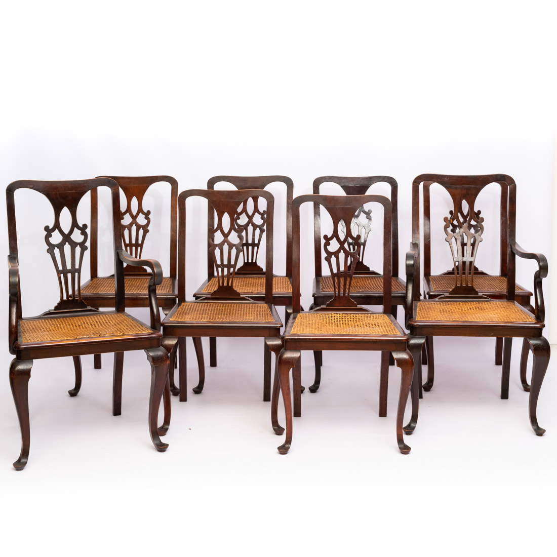 Estilo Inglês, em mogno, composto por mesa com duas tábuas de extensão, dois aparadores, cristaleira, seis cadeiras e par de cadeirões com costas vazadas e fundos em palhinha. Pequenas falhas e defeitos ?