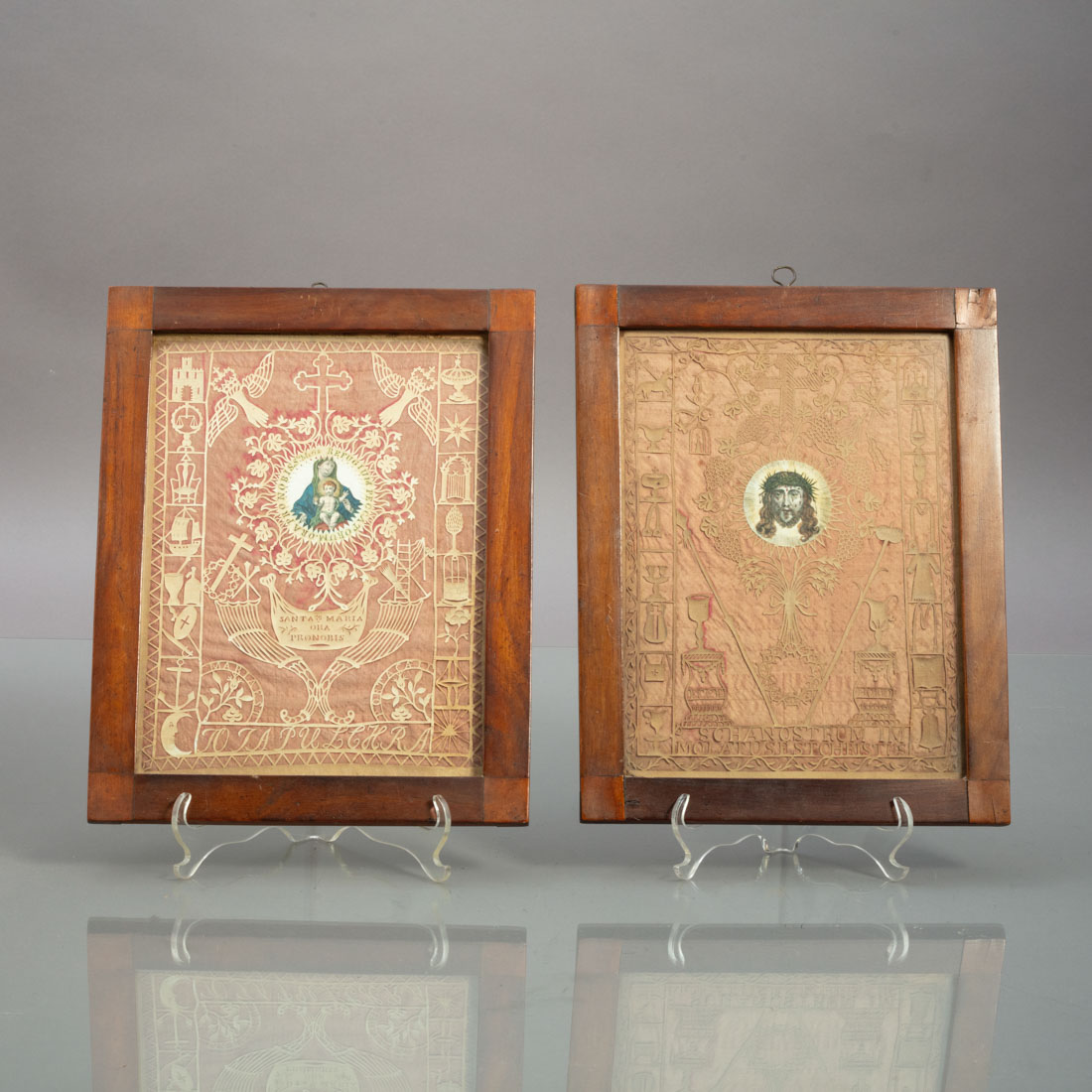 Impressão colorida e papel recortado sobre seda, trabalho conventual. Europa, Séc. XIX. Sinais de uso.