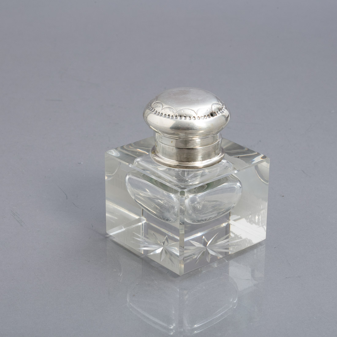 Em cristal facetado, tampa em prata portuguesa contraste águia (1938-1984) de 833, decorada com gravados. Ínfimas esbeiçadelas na base.