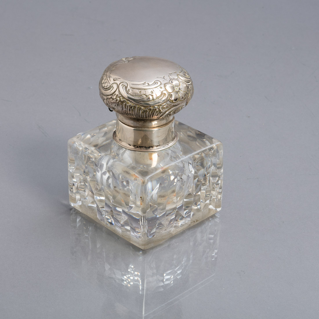 Em cristal moldado, tampa em prata portuguesa contraste águia (1938-1984) de 833, decoração relevada "flores". Pequenos defeitos na tampa.