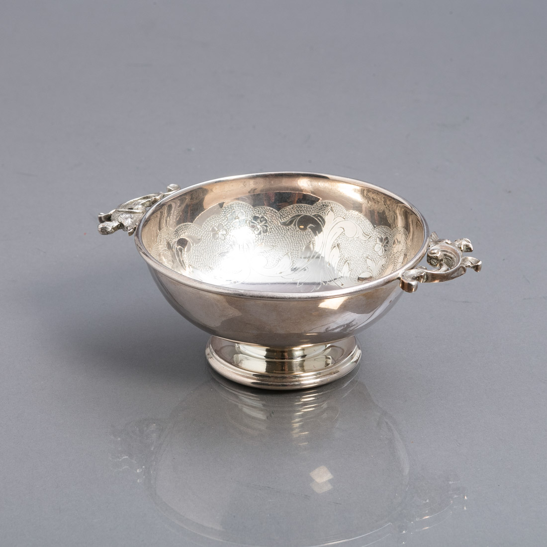 Em prata portuguesa contraste javali (1887-1937) de 833, decoração gravada com elementos vegetalistas, pegas relevadas com pássaros. Sinais de uso.