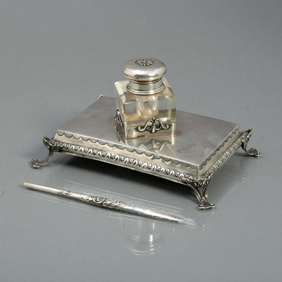 Em prata portuguesa contraste javali (1887-1937) de 833, decoração relevada e gravada, monogramada, recipiente em vidro. Pequenas amolgadelas, caneta com restauro.