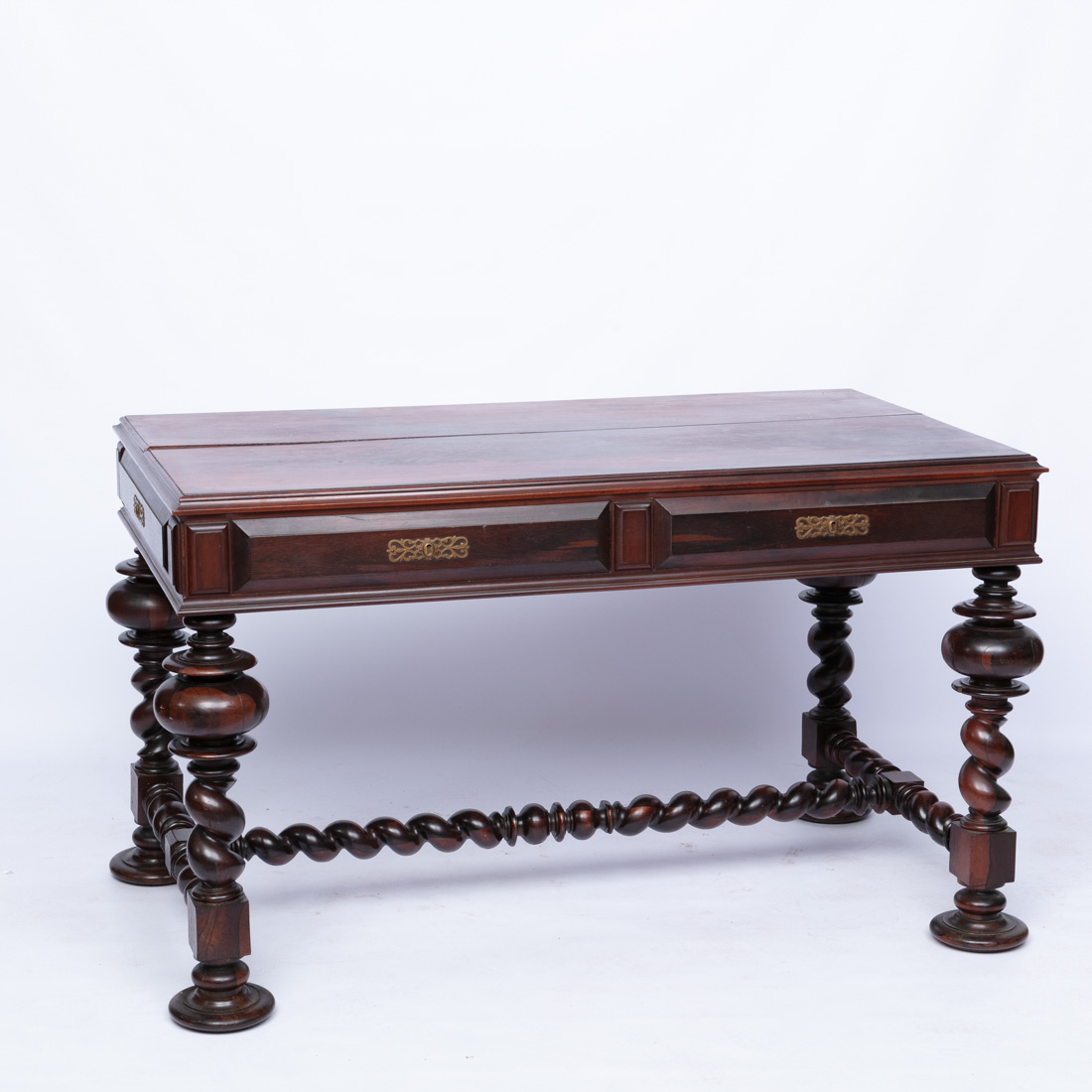 Em pau santo, pernas e travejamentos torneados, de duas gavetas, simulando quatro, ferragens em metal amarelo. Séc. XIX/XX. Pequenas falhas, tampo com defeitos.