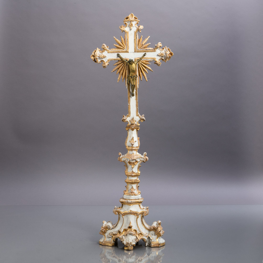 Em madeira entalhada, pintada e dourada. Falhas e pequenos defeitos.
