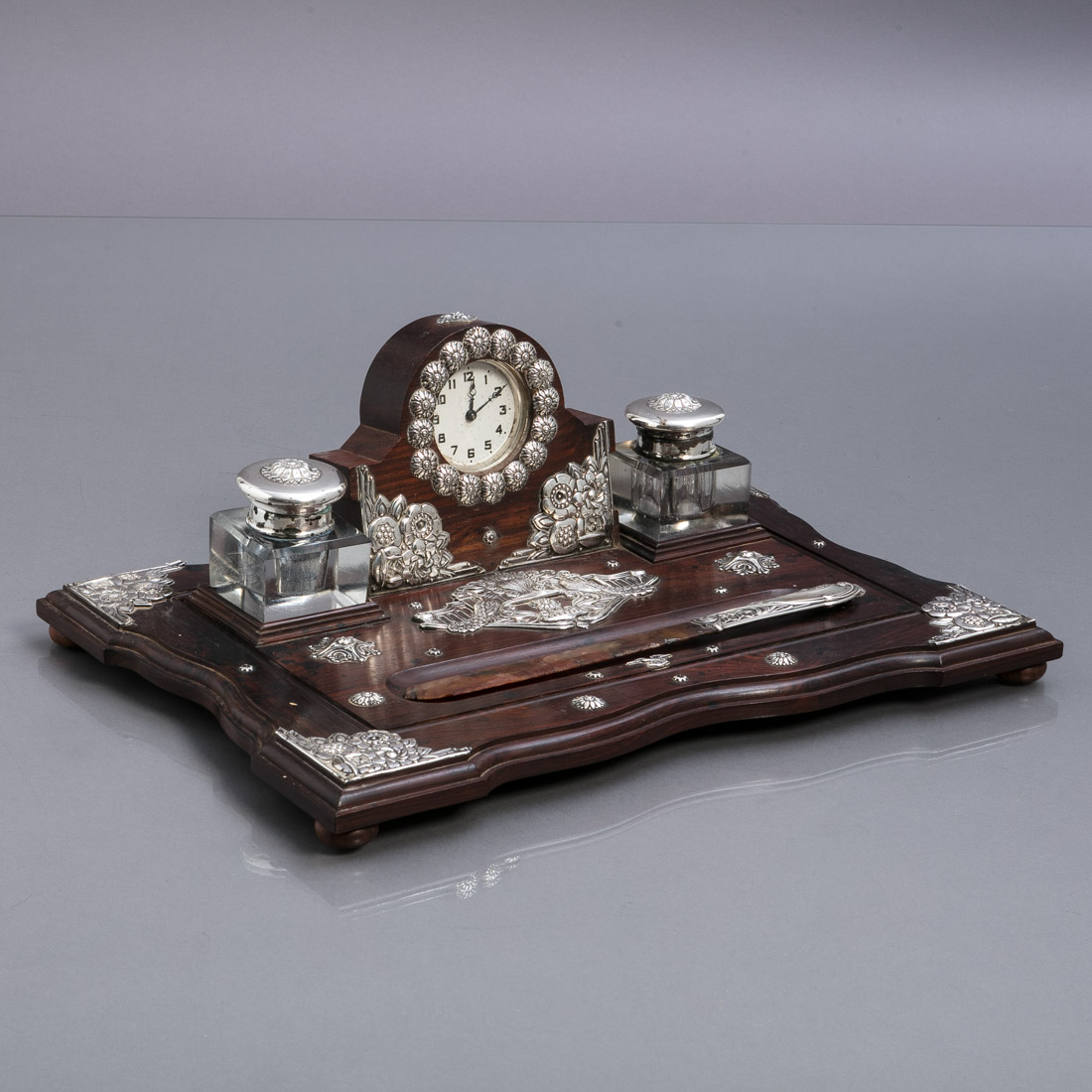 Em pau santo, aplicações em prata portuguesa contraste javali (1887-1937) de 833, decoração relevada "flores e pássaros" com relógio e dois recipientes em vidro facetado, abre cartas com falhas na lamina, pequenos defeitos.