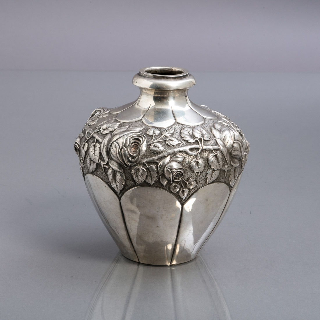 Em prata portuguesa contraste javali (1887-1937) de 833, decoração relevada "rosas". Pequenas amolgadelas.