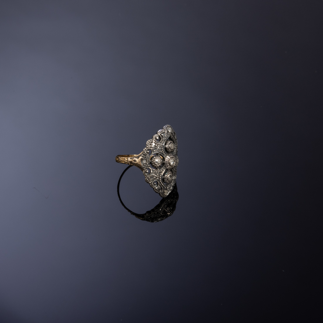 Em ouro de 19.2Kt., contraste tigre (1887-1937) e prata, cravejada com diamantes talhe rosa e brilhante. Sinais de uso, pequenos defeitos.