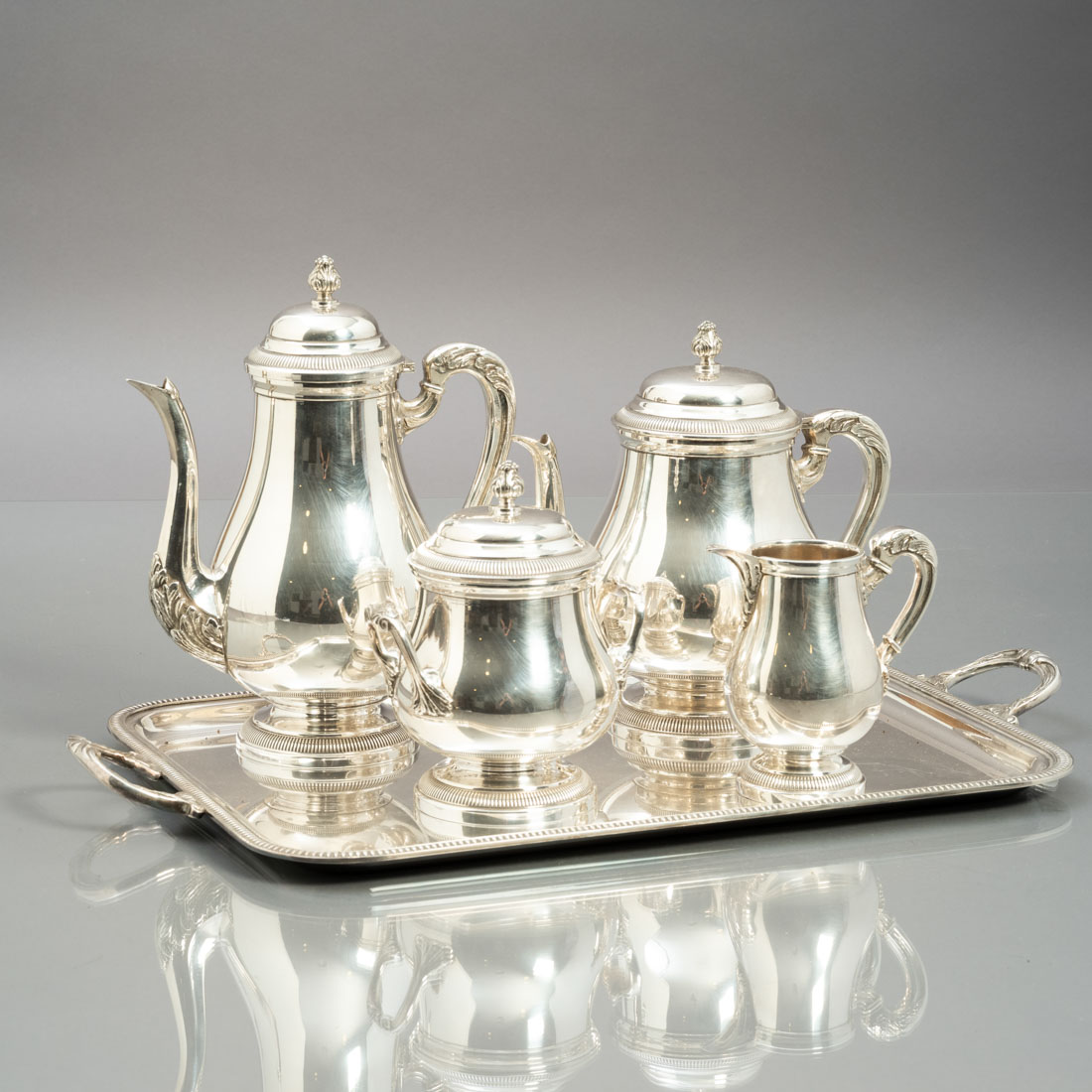 Em casquinha francesa marcada Fabre, pegas relevadas. Composto por bule, cafeteira, leiteira, açucareiro e tabuleiro. Sinais de uso, açucareiro com amolgadela.