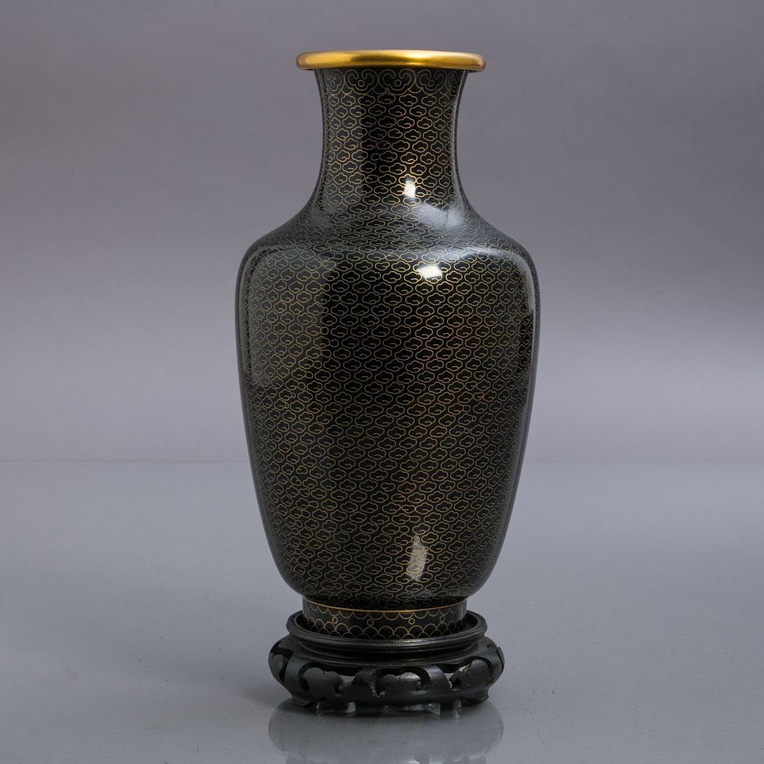 Em metal cloisonné, monocroma a negro, peanha em madeira entalhada e vazada. China, Séc. XX. Sinais de uso.