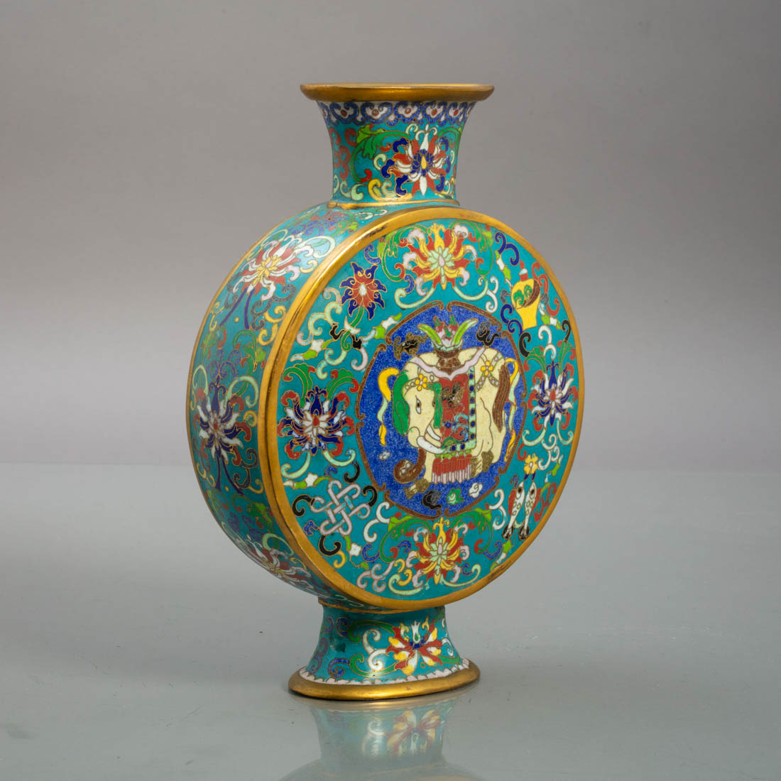 Em metal cloisonné, decoração policromada "animais, flores de lótus e objectos". China. Séc. XIX/XX.. Sinais de uso
