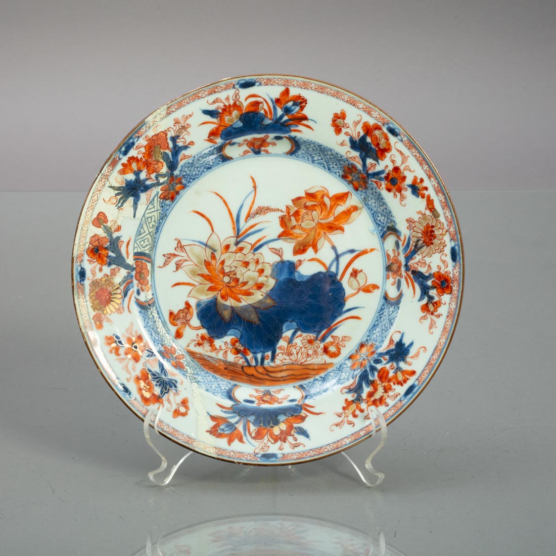 Em porcelana da China companhia das Índias, Séc. XVIII, decoração "Imari" a azul, rouge de fer e dourado "flores". Restauro na aba, partido e colado (5,5 cm).