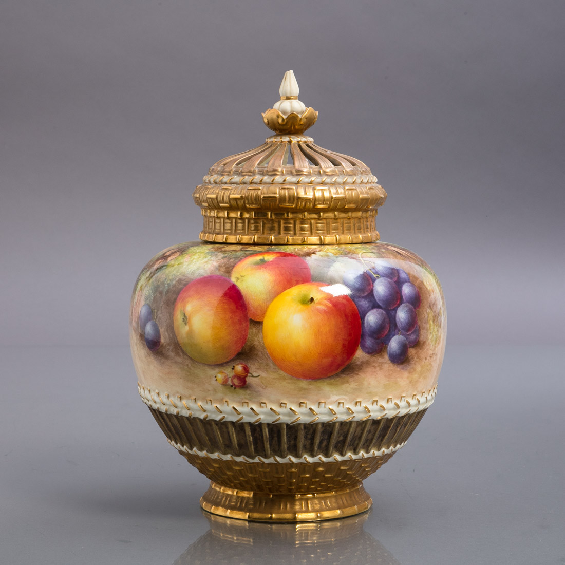 Em porcelana moldada e relevada, marcada Royal Worcester, decoração policromada e dourada com frutos, assinada. Inglesa, Séc. XX. Pequena falha na extremidade do pomo e pequeno defeito na tampa.