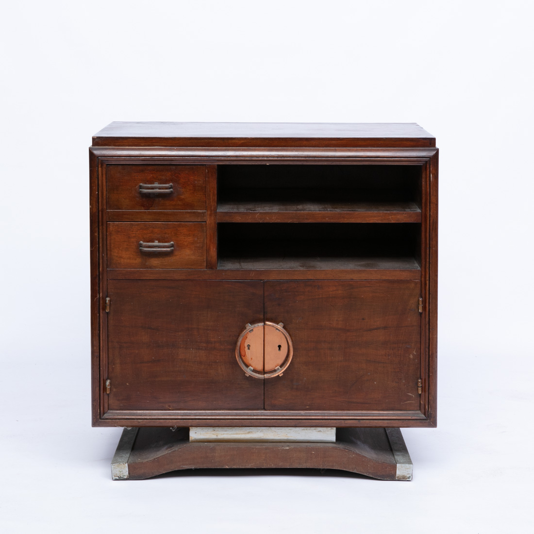 Em nogueira e folheado a nogueira, puxadores em metal cobreado, de duas portas, pequenas gavetas laterais e prateleira. Sinais de uso e pequenos defeitos.