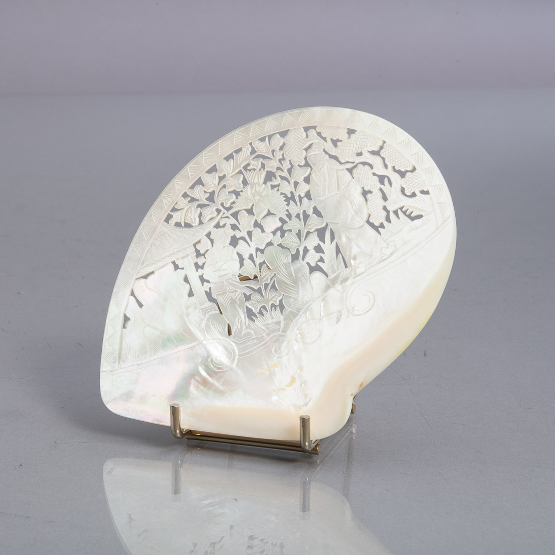 Em madrepérola esculpida e vazada "paisagem oriental com figuras". China Minguo (1912-1949). Sinais de uso.