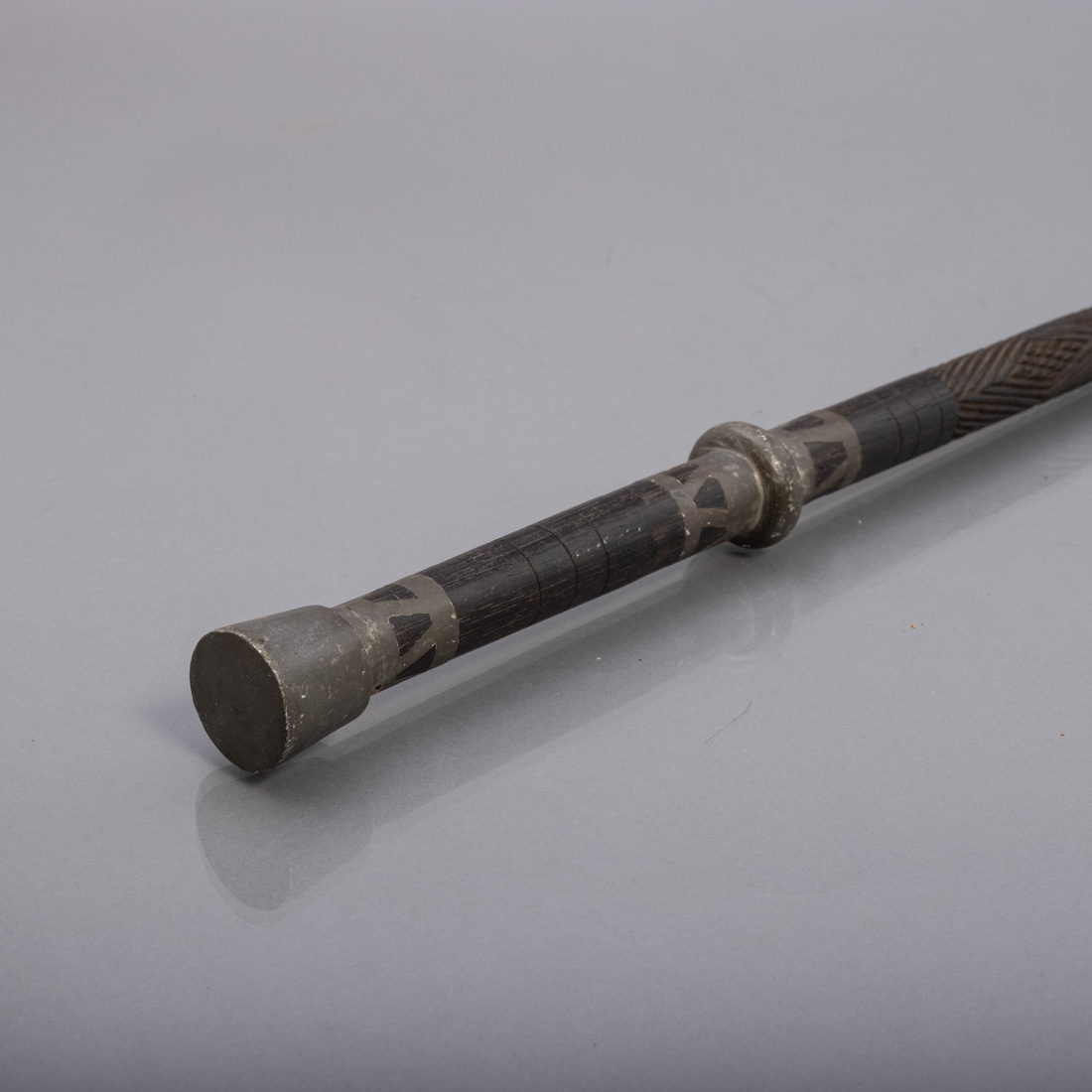 Em madeira exótica esculpida com desenho geometrico, aplicações em estanho, Angola, Sec. XIX. Sinais de uso.