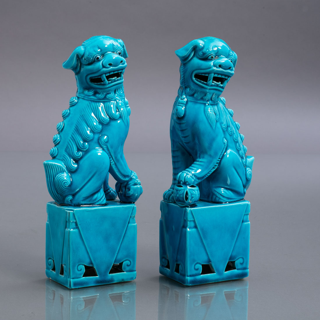 Esculturas em porcelana da China, decoração monocroma azul turquesa. Sinais de uso.