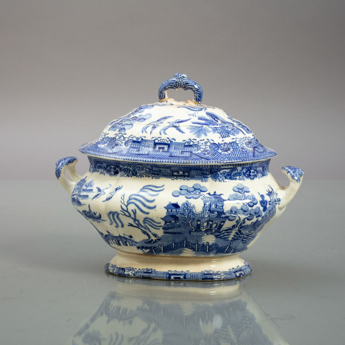 Em loiça pó de pedra inglesa "Davenport", decoração a azul "paisagem oriental". Séc. XIX. Sinais de uso, tampa com cabelo e pequena colagem.