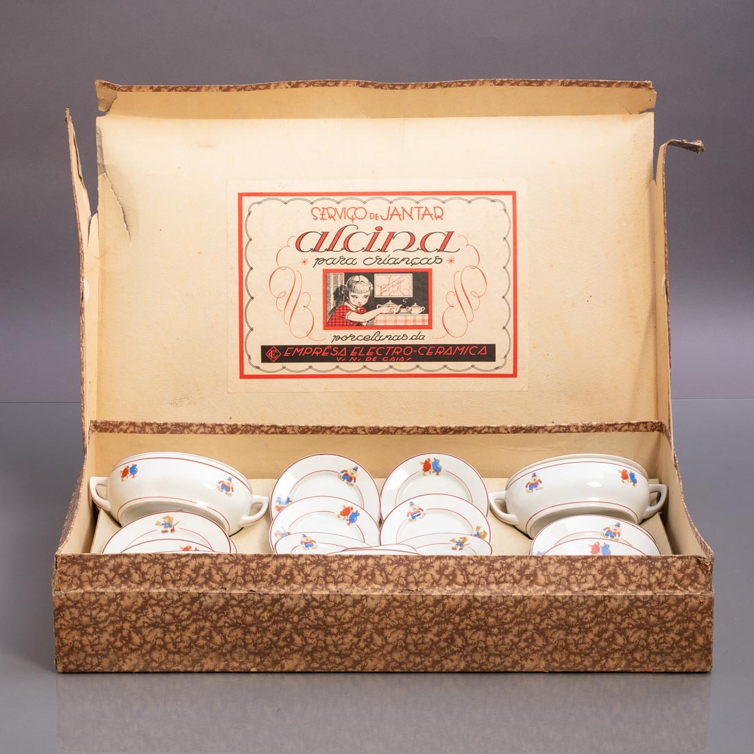 Em porcelana moldada fabrico da Electro Cerâmica do Candal, decoração policromada com motivos infantis. Composto por 2 terrinas, molheira, 3 travessas e 12 pratos. Para casa de bonecas em caixa original. Caixa com falhas.