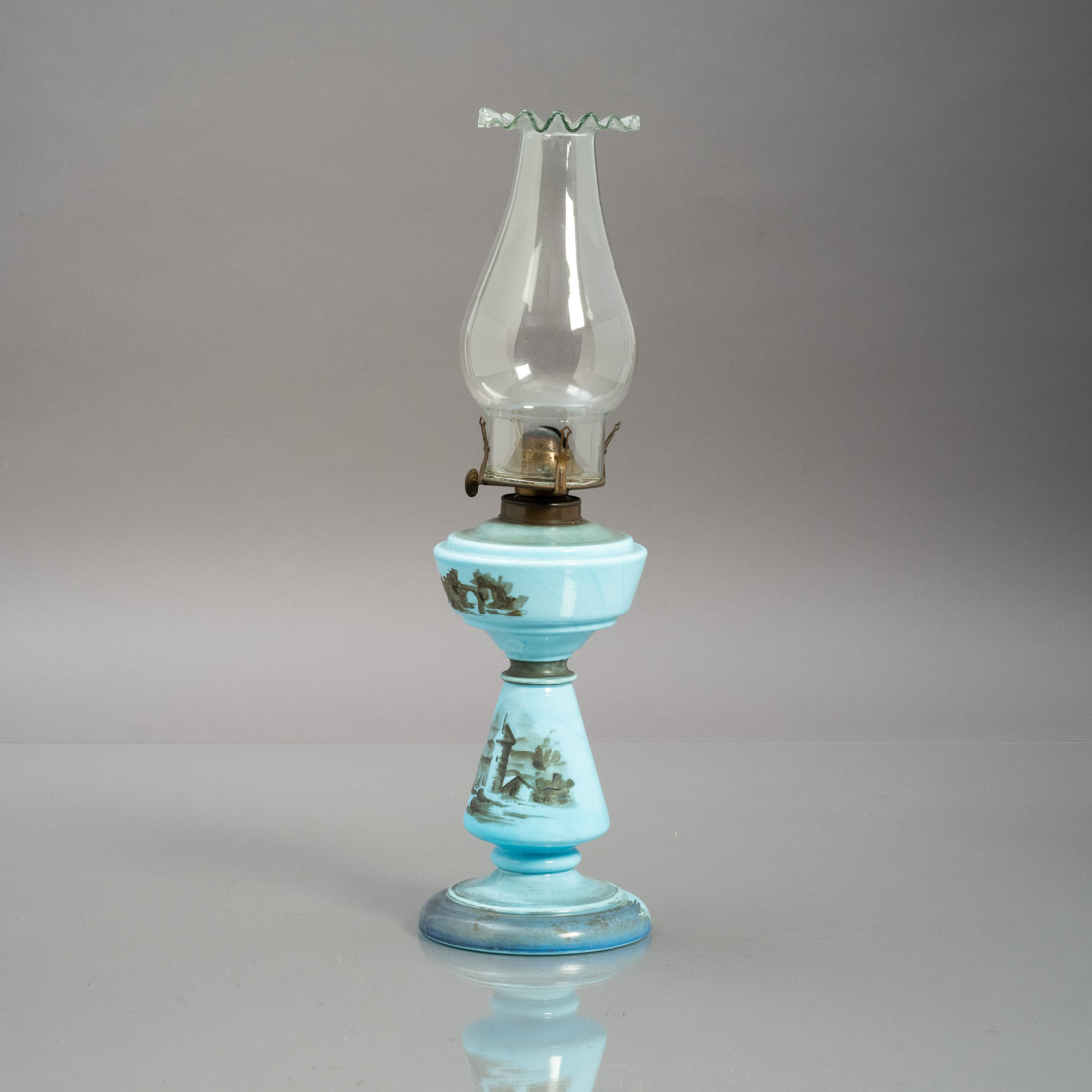 Em vidro opalino pintado, decoração a grisaille "paisagem". Sinais de uso.