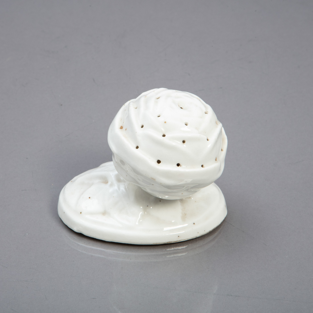 Em porcelana moldada e relevada, decoração monocroma a branco. Defeito de fabrico, sinais de uso.