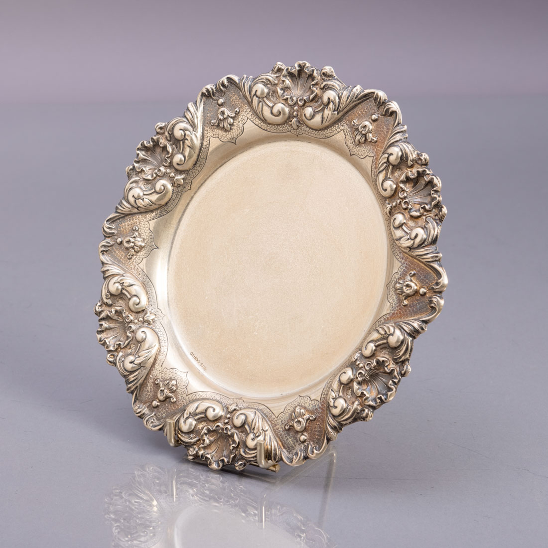 Em prata portuguesa contraste águia (1938-1984) de 833, marcada Reis - Porto, decoração relevada com elementos vegetalistas e concheados. Sinais de uso.