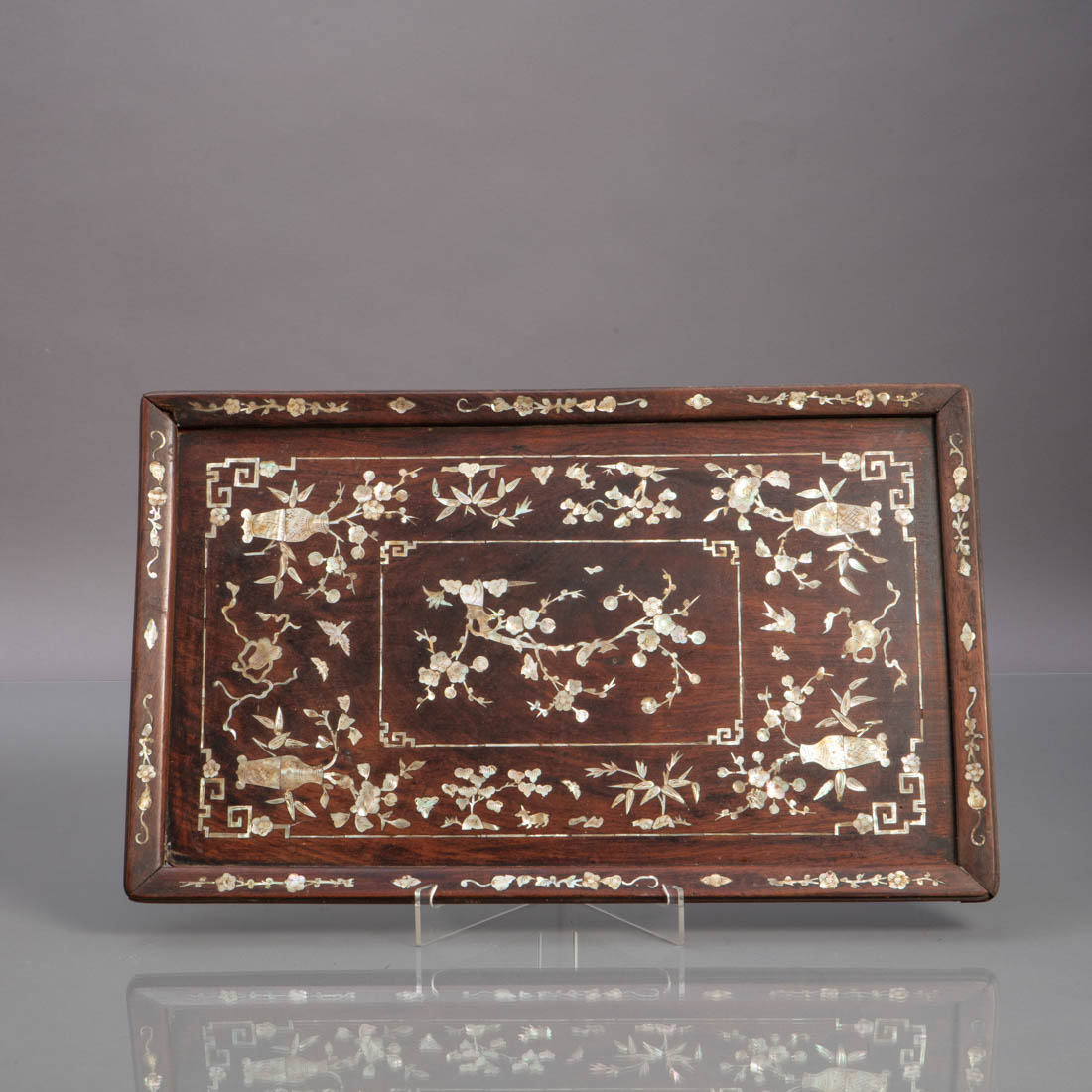 Em tamarindo com embutidos em madrepérola "flores, pássaro e objectos". China, Séc. XIX/XX. Pequenas falhas e defeitos.