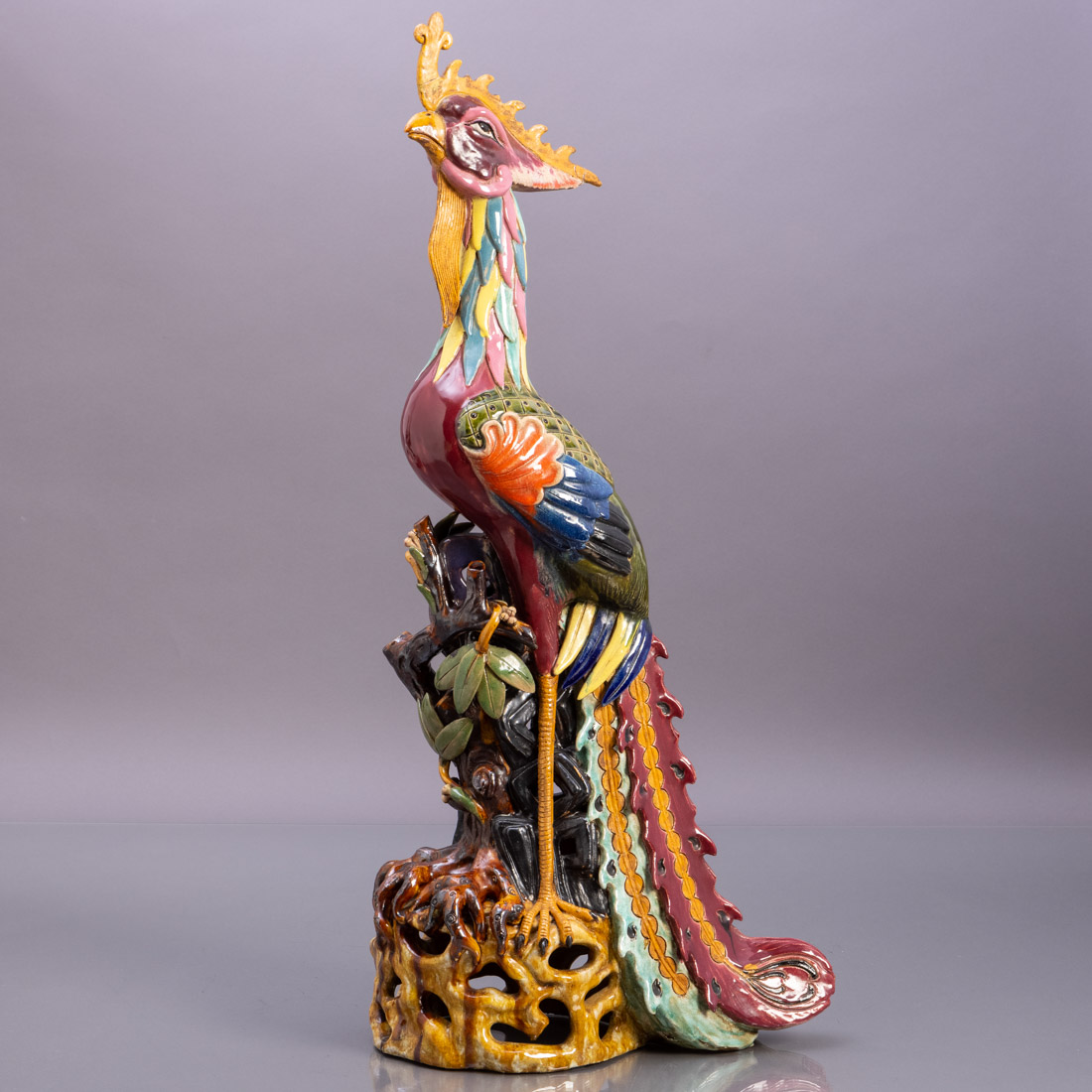 Escultura em cerâmica vidrada chinesa, decoração policromada. Sinais de uso, crista colada.