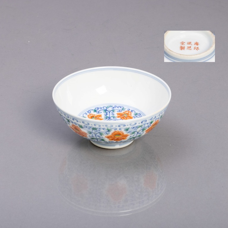 Em porcelana da China, decoração policromada com enrolamentos e lotus. Marcada. Sinais de uso,