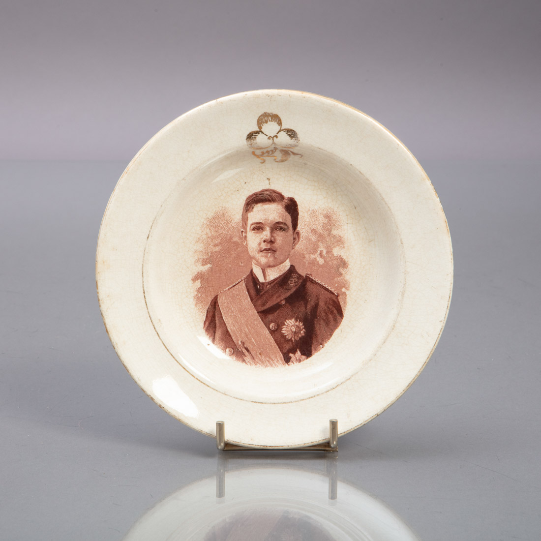 Em loiça pó de pedra de Sacavém, decoração estampilhada com efígie de Sua Majestade o Rei D. Manuel II, ainda como Príncipe herdeiro. Craquelé e desgaste.