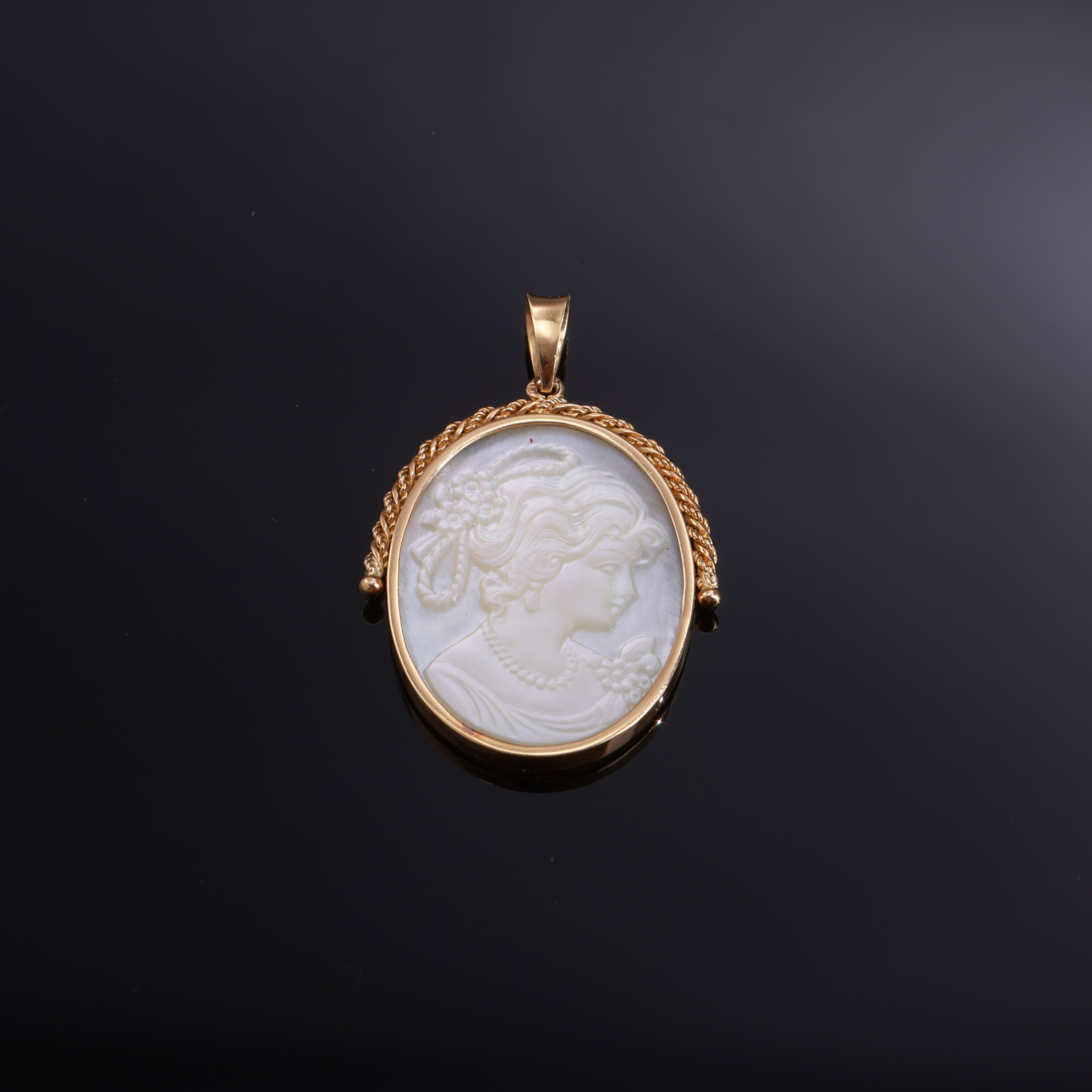 Aro em ouro de 19.2Kt., contraste veado (pós 1985), placa oval de madrepérola esculpida "busto feminino". Sinais de uso.