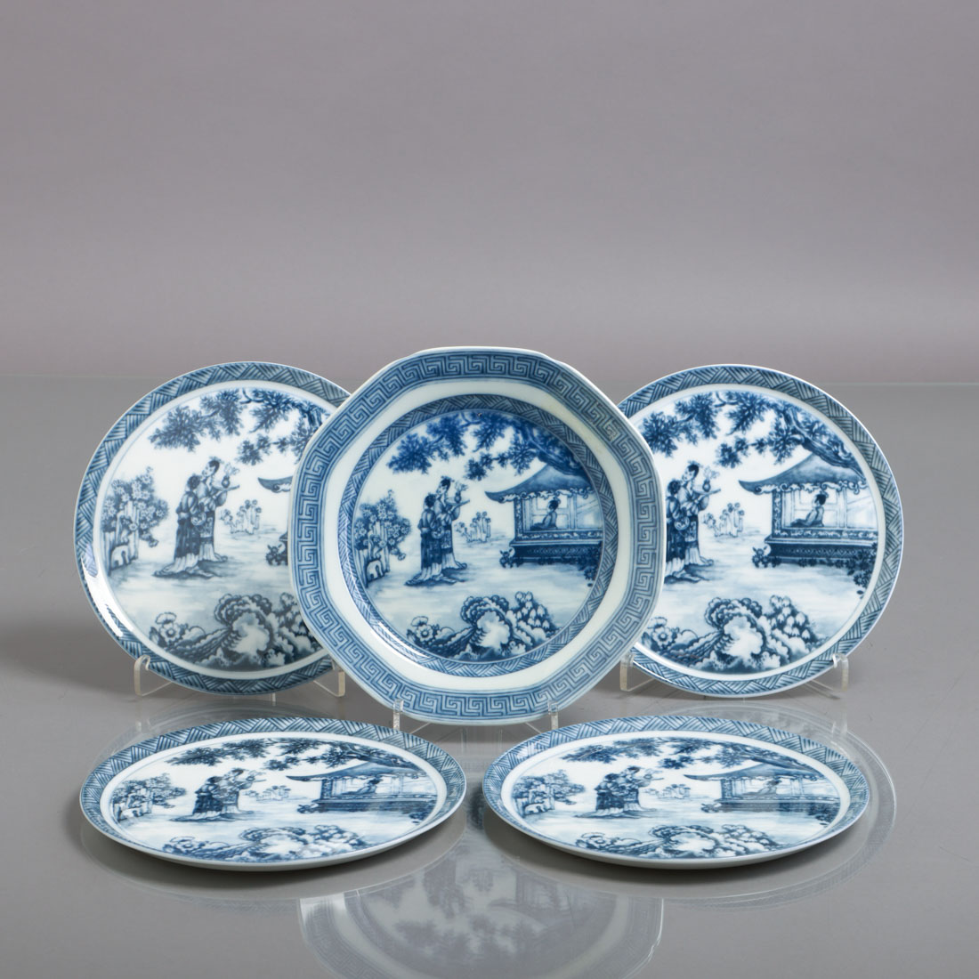 Em porcelana moldada (1980-1992), decoração a azul "paisagem oriental e figuras", um recortado, os restantes "Exposição Vista- Alegre, Espinho 1990". Sinais de uso.