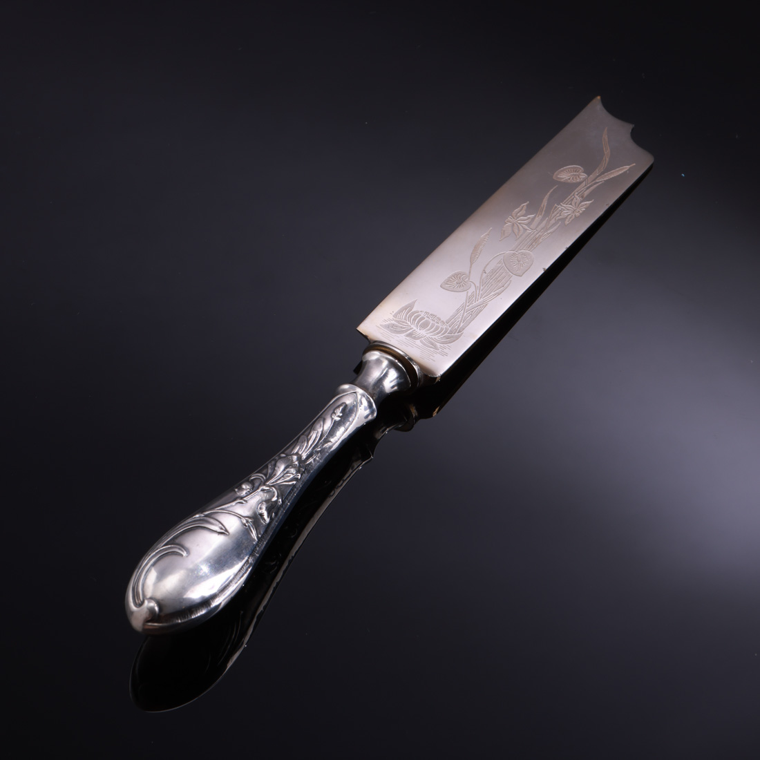 Cabo em prata portuguesa contraste javali (1887-1937) de 833, decoração relevada "flores", lamina decorada com gravados. Sinais de uso.