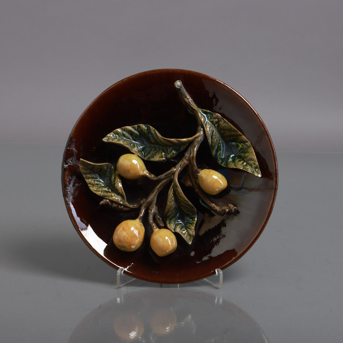 Em cerâmica vidrada das Caldas, decoração policromada com frutos em relevo. Sinais de uso, colado com restauro.